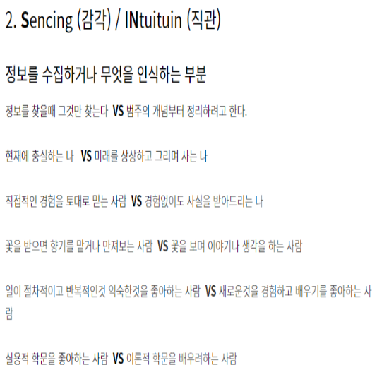 감각 (Sensing) - 오감 및 경험에 의존. 현실주의적인 타입. 실제의 경험을 중시하고 지금에 초점을 맞추어 일처리한다. 숲보다 나무를 보려는 경향이 강하다.
