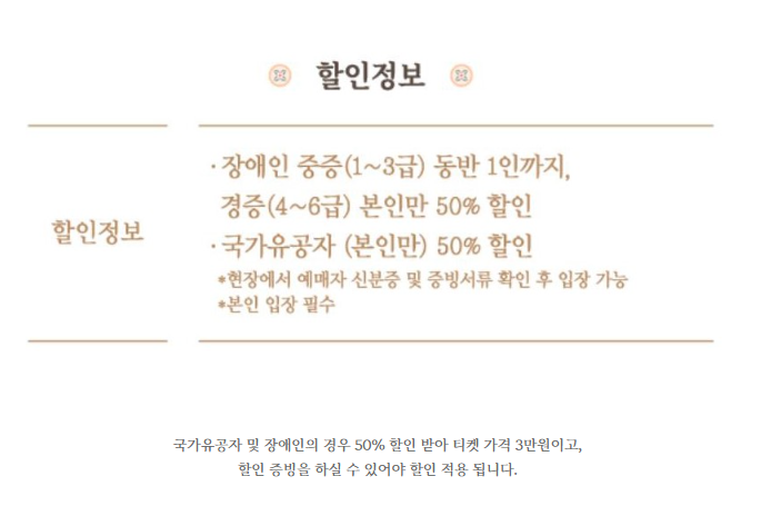 국가 유공자 및 장애인의 경우 50%할인받아 티켓 가격이 3만원이고 할인증빙을 하실 수 있어야 할인적용됩니다.