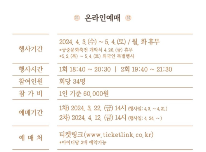 경복궁 민속박물관 앞 안내데스크에서 접수하고 있으니 편한 신발과 겉옷을 준비해서 가셔야 춥지않고 편하게 관람이 가능하실겁니다. 1-4mm 예보시에는 우천시에도 정상진행이 되고 5mm이상 우천시에는 행사가 취소되며 전액환불됩니다.