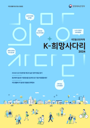 문체부는 '통합공공 임대주택' 등 주거 지원 정책, 냉 · 난방비 지원 정책을 담은 '에너지 복지' 등 포괄적인 취약계층 복지정책을 담았다고 합니다. 이와 더불어 '케이-패스', '청년문화예술패스' 등 신규 지원제도와 청년을 위한 일자리 · 자산형성 · 주거 · 사회복지 지원 등 최신지원 정보를 총망라하도록 펴냈습니다.