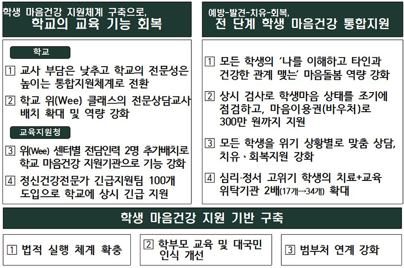 이번 방안은 학교의 교육 기능 회복을 돕고 학생 마음건강 문제의 ‘예방-발견-치유-회복’ 등 모든 단계를 통합지원 하기 위해 보건복지부, 여성가족부 등 관계부처 및 시·도교육청 등 관계부처 합동으로 마련했습니다.