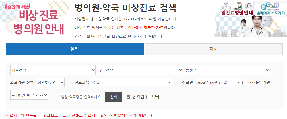 | 문여는 병의원 약국찾기 ☞ 응급의료포털 ☞ 야간휴일진료가능 병의원 및 동네문여는 병의원현황 ☞ 우리아이 안심 의료기관 ☞ 휴일지킴이약국 |