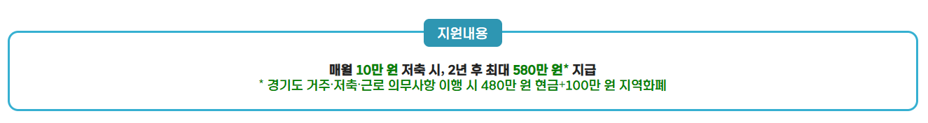 매달 10만원 저축 시, 경기도에서 동일 금액인 10만원을 추가 지원해주는 꿈같은 제도입니다. 2년 후에는 현금 480만원 + 지역화폐 100만원 = 총 580만원을 수령하게 되죠. 실질적으로 본인이 저축하는 금액은 240만원인데, 경기도에서 340만원을 더해주는 셈입니다.