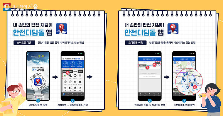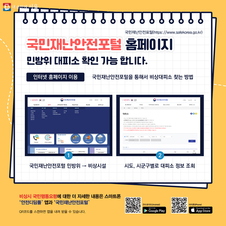 일어나지 않길 바라지만 만약 안보를 위협하는 일이 벌어진다면, 무엇보다 ‘안전한 장소’로 피하는 것이 중요한데요, 오늘은 ‘집에서 가장 가까운 대피소’를 찾는 방법에 대해 알려드립니다. 위기 상황이 닥쳤을 때 곧바로 행동에 옮길 수 있도록 미리 알아두고 대비하시길 바랍니다.