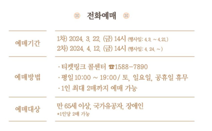 전화의 예매의 경우에도 티켓링크 콜센터에서 가능한데 1인 최대 2매까지 가능하고 만 65세 이상, 국가 유공자, 장애인 관람겍만 전화예매가능합니다.