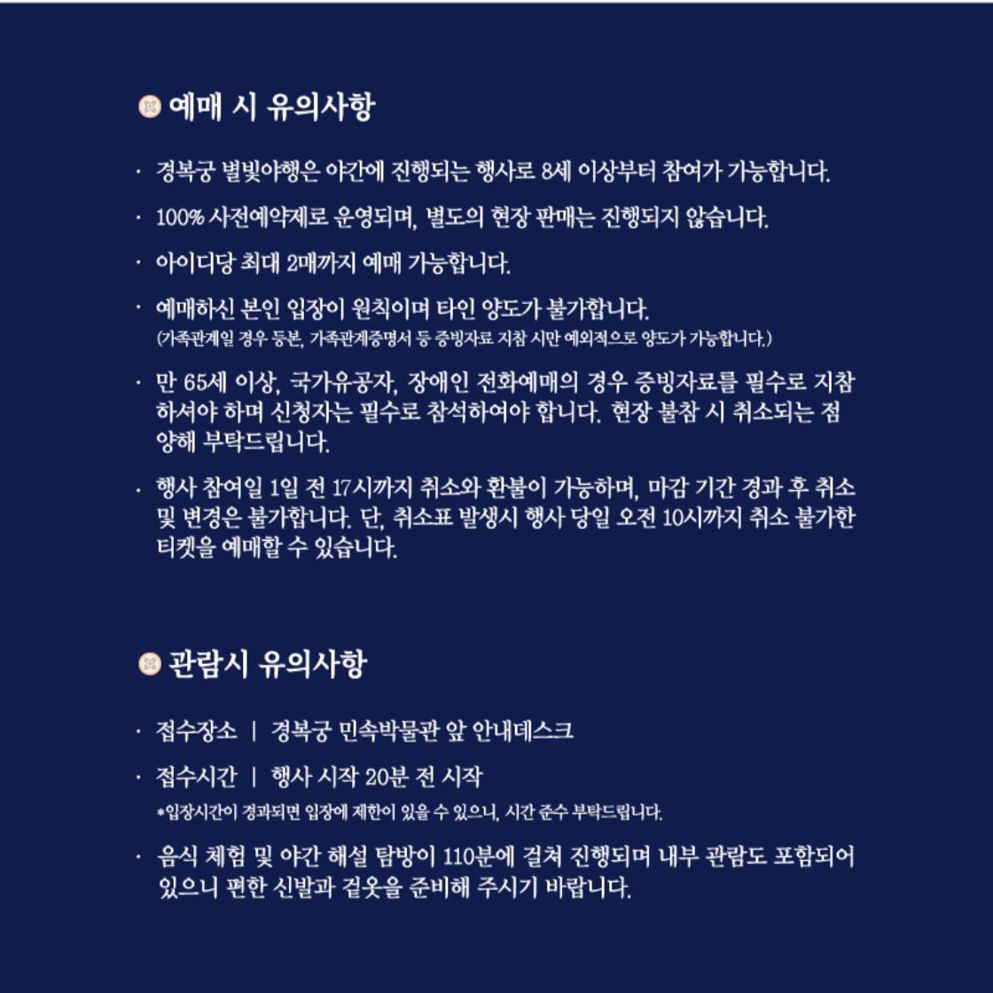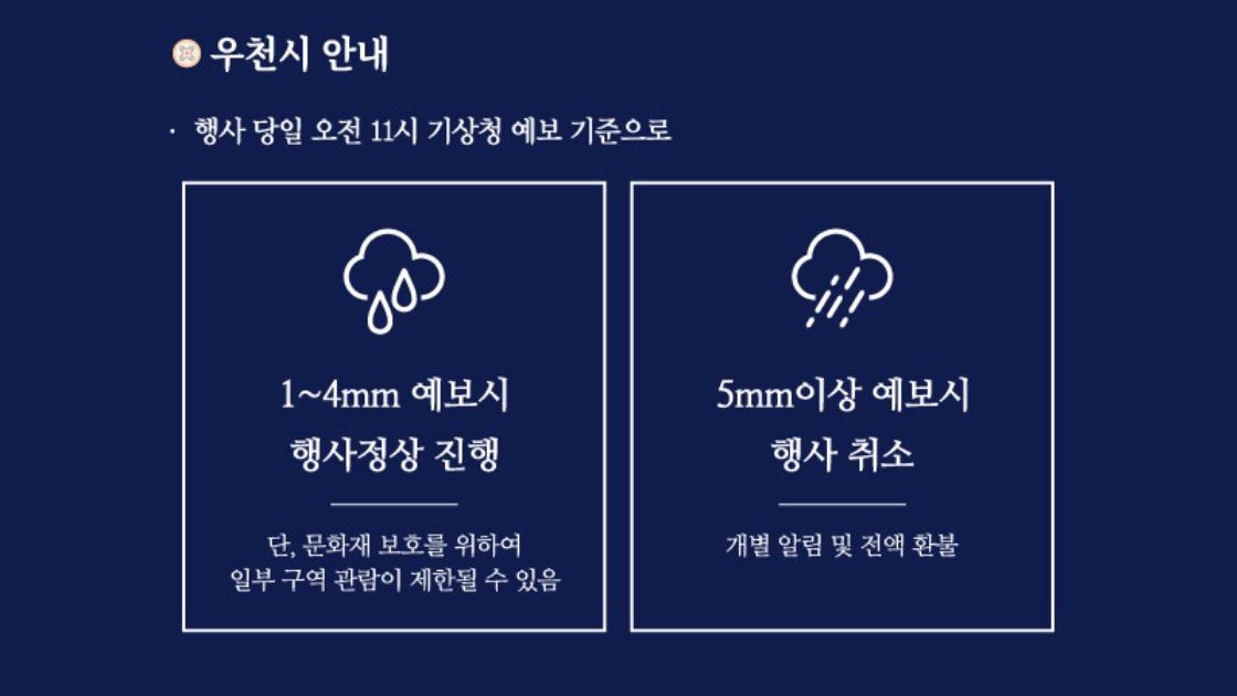 경복궁 민속박물관 앞 안내데스크에서 접수하고 있으니 편한 신발과 겉옷을 준비해서 가셔야 춥지않고 편하게 관람이 가능하실겁니다. 1-4mm 예보시에는 우천시에도 정상진행이 되고 5mm이상 우천시에는 행사가 취소되며 전액환불됩니다.