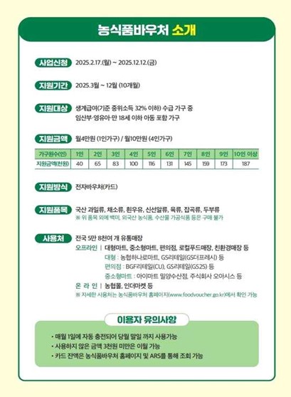 - 2025년 농식품바우처 이용가구 중 기준일(2025.12.22) 기준 지원 자격 충족 시 별도 절차 없이 자동 승인 처리될 수 있습니다.