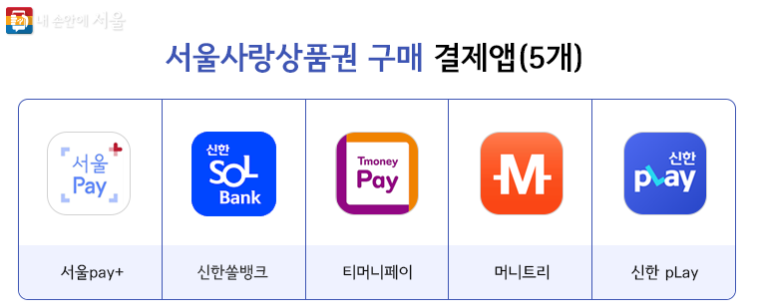 서울사랑상품권은 서울페이플러스(서울 pay+)를 포함해 신한쏠뱅크, 티머니페이, 머니트리, 신한쏠페이 등 5개 앱에서 5% 할인된 금액으로 1인당 50만 원까지 구매할 수 있으며 보유한도는 1인당 150만 원이다.