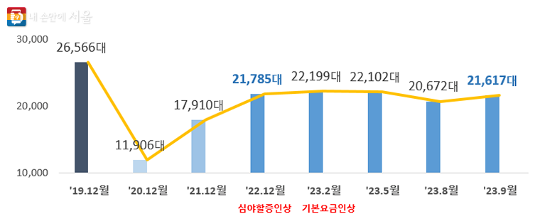 하지만 개인택시 기사의 고령화와 법인택시 기사 감소 등으로 인해 코로나19 이전인 2019년 12월 기준에는 못 미치는 실정이다.