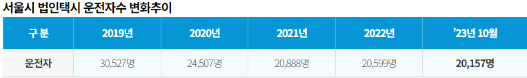 특히 법인택시의 경우, 코로나19 기간 운행수입 감소로 1만여 명이라는 대규모 이직이 있었고, 타 직종 대비 낮은 처우로 신규인력 수급이 힘든 실정이다.