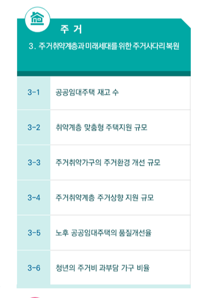 세부 지표로는 ▴공공임대주택 재고 수 ▴주거취약계층의 주거환경 개선 규모 ▴청년 주거비 과부담 가구 비율 등이 있다.