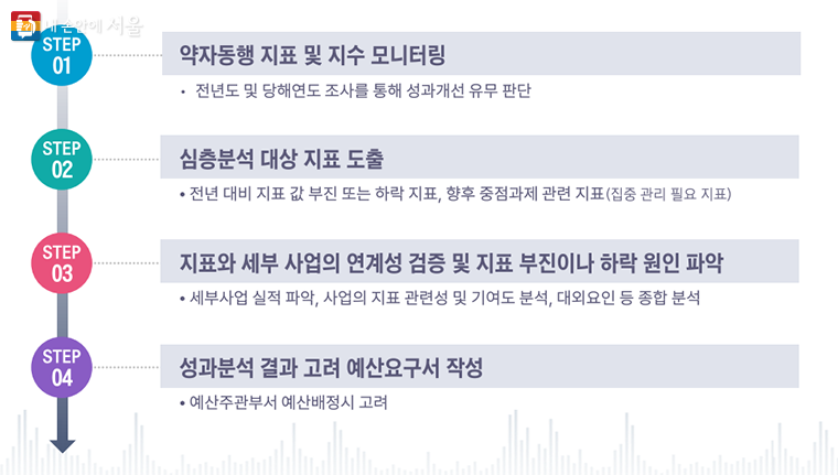 시민생활과 밀접한 영역을 평가·분석하여 사회적 위험을 조기 발굴하고 시민생활을 개선하겠다는 것이 핵심인데요, 도시가 추진 중인 정책 성과를 스스로 평가해, 정책 개발과 예산 편성에 활용하는 것은 서울시가 세계 최초입니다.