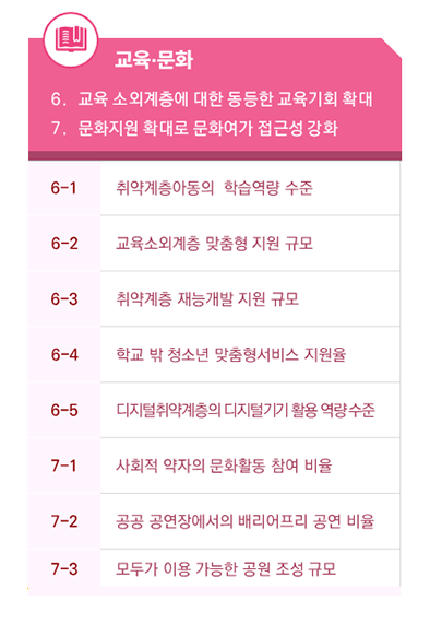 교육·문화 영역은 가구소득 수준에 따른 교육격차 해소, 교육 소외계층 기회 확대와 문화여가 접근성 강화를 통한 문화향유 격차 감소를 위한 8개 지표로 구성된다.