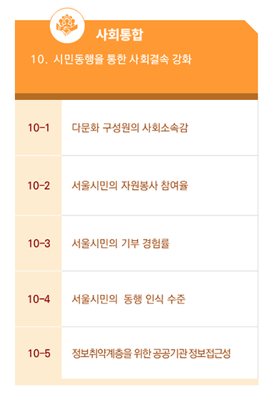 마지막으로 사회통합 영역이다. 사회적 양극화와 불평등을 해소하고 시민동행을 통한 사회결속 강화가 주요 과제로, 5개 지표를 관리한다.