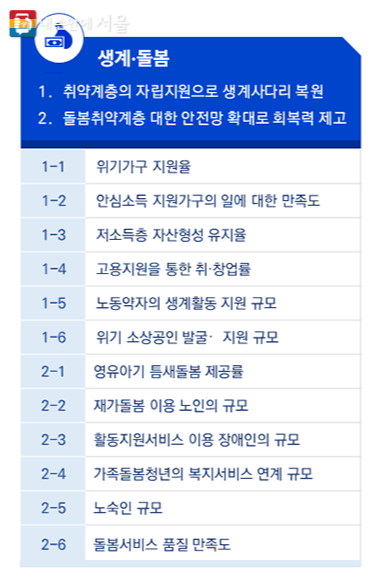영역별 지표를 살펴보면, 생계·돌봄 영역은 소득불균형과 사회적 위험 발생 등으로 증가하고 있는 취약계층 자립 지원을 위한 ‘생계 사다리 복원’과 인구‧가족구조 변화에 따른 ‘돌봄 취약계층 안전망 확대’를 목표로 한다.