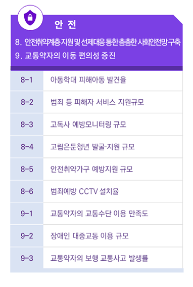 안전 영역은 고립‧은둔청년을 비롯해 독거노인, 교통약자 등 사회적 약자에 대한 촘촘한 안전망 구축과 재난‧안전사고 대응이 목표인 9개 지표가 포함된다.
