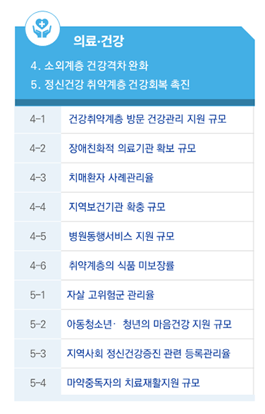 의료·건강 영역은 코로나19 등 사회적 변화와 경제적 양극화로 발생하는 소외계층 건강 격차 완화, 정신건강 취약계층의 건강 회복을 목표로 총 10개 지표를 반영했다.