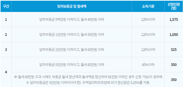 월세 60만원 초과자 중에서 보증금 월세 환산액(주택임대차보호법에 따라 환산율 5.25% 적용)과 월세액을 합산해 ‘81만원 이하’인 경우에는 신청할 수 있습니다.