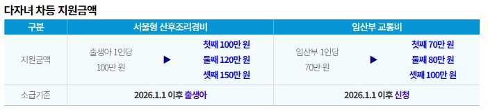 서울형 산후조리경비는 2026년 1월 1일 이후 출생한 자녀부터, 임산부 교통비는 2026년 1월 1일 이후 신청 건부터 새 기준이 적용됩니다.