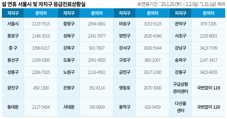 문여는 병의원 연휴 기간 ‘문 여는 병의원, 약국’에 대한 정보는 서울시 ‘2025 설 연휴 종합정보’ 누리집, 25개 자치구 누리집, 응급의료포털, 네이버 지도, 카카오맵에서 확인할 수 있습니다.