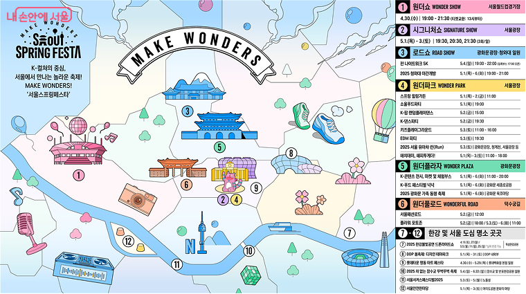 따뜻한 봄바람과 함께 서울 전역이 축제의 열기로 물들 예정입니다. 4월 30일부터 5월 6일까지 7일간, 서울광장, 광화문광장, 덕수궁길 등 서울 도심 곳곳에서 다채로운 프로그램으로 가득한 '서울 스프링페스타'가 펼쳐집니다. K-컬쳐의 매력을 듬뿍 담은 이번 축제는 '메이크 원더스(Make Wonders)'라는 주제로 잊지 못할 추억을 선사할 것입니다.