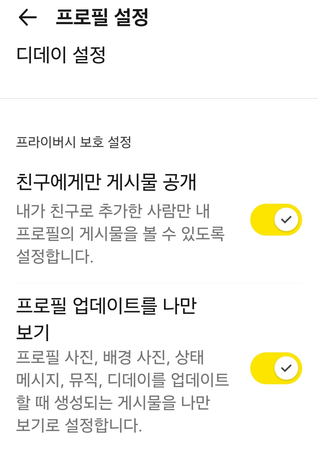 카카오톡은 기본적으로 내 프로필 사진과 게시물이 친구들에게 공개됩니다. 원치 않는 경우 아래 방법으로 비공개로 바꿀 수 있습니다.