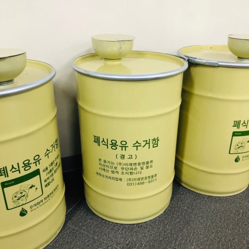 - 노란색 폐식용유 수거함이 눈에 띄는 위치