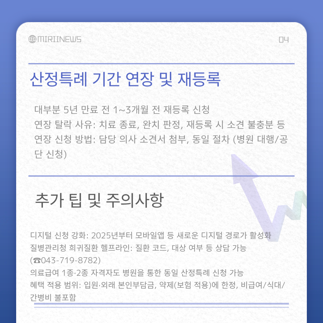 - 연장 신청 방법: 담당 의사 소견서 첨부, 동일 절차 (병원 대행/공단 신청)