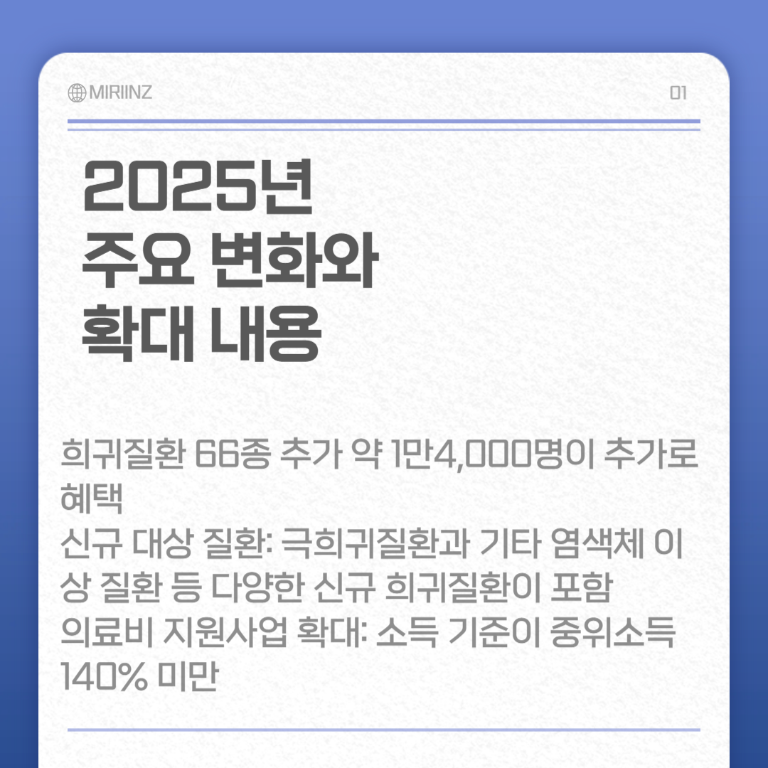 - 의료비 지원사업 확대: 희귀질환자 의료비 지원사업도 대상질환이 1,338개로 늘어나고, 소득 기준이 중위소득 140% 미만으로 완화되어 더 많은 환자와 가족이 혜택을 받을 수 있게 되었습니다.