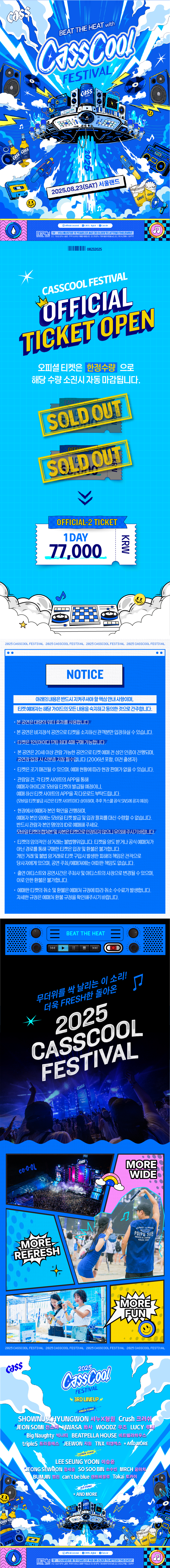 무더위를 날려버릴 짜릿한 축제, 2025 카스쿨 페스티벌 (CassCool Festival)이 과천 서울랜드에서 펼쳐집니다! 더욱 강력해진 물의 스케일, 핫한 아티스트 라인업, 그리고 쿨한 프로그램까지! 청량한