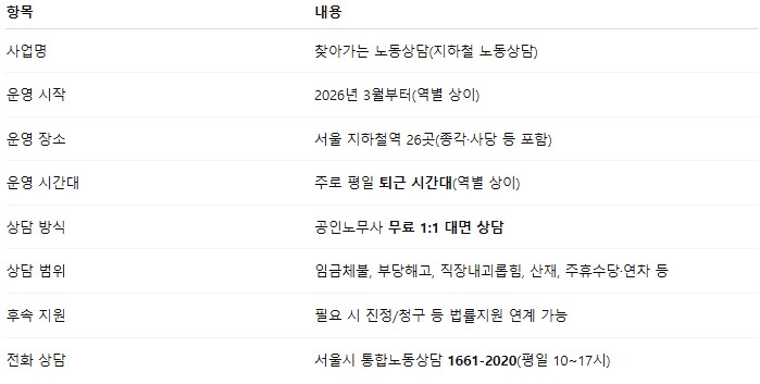 서울시 ‘찾아가는 노동상담’이 2026년 3월부터 지하철역 26곳에서 운영됩니다. 퇴근시간대 역사 내 상담부스에서 공인노무사 무료 1:1 대면상담(임금체불·부당해고·직장내괴롭힘·산재)과 집중상담일, 통합상담 1661-2020까지 정리.