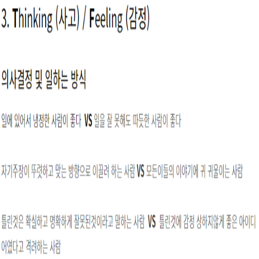 사고 (Thinking) - 업무 중심 타입. 진실과 사실에 주로 관심을 가지며 '맞다, 틀리다'의 판단 선호. 이성적이고 논리적, 분석적이며 객관적으로 사실을 판단한다. 원리와 원칙을 중시한다. 논평하기를 좋아한다.