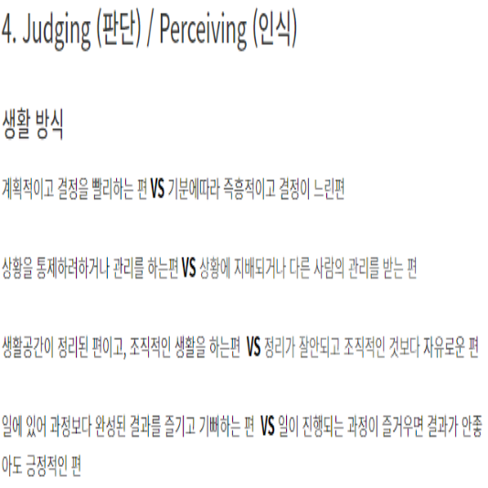 인식 (Perceiving) - 유동적인 목적과 방향 선호. 자율적이고 체계는 없지만 재량에 따라 일정을 변경할 수 있다. 상황에 따라 적응하며 결정을 보류한다.