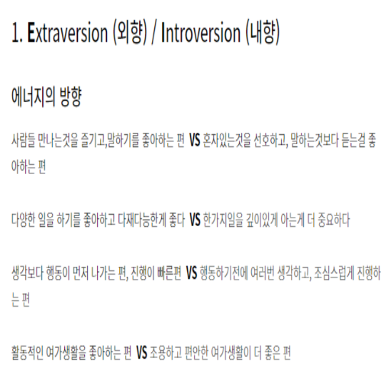 외향 (Extroversion) - 자기 외부에 주의 집중. 다른 누군가에게 발상, 지식이나 감정을 표현함으로써 에너지를 얻는다. 사교적, 활동적이며 외부 활동에 적극성을 발휘한다. 폭넓은 대인관계를 가지며 글보다는 말로 표현하기를 좋아한다. 경험을 통해 이해한다.